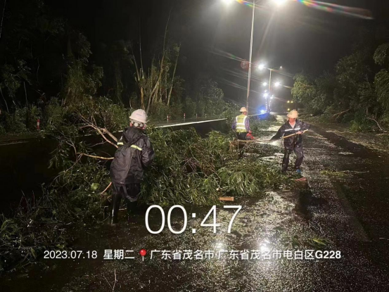 “大家做好安全措施,立即前往228國道做好道路排險工作?!奔瘓F道路養(yǎng)護負責人,迅速組織養(yǎng)護人員連夜頂風“逆行”,冒雨出動,迅速開展清障保通工作,以最快速度對倒扶、斷枝、傾斜等樹木進行清理,保障養(yǎng)護路段交通安全、有序、暢通。